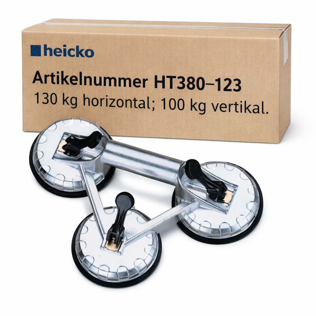 Der heicko 3-Kopf Saugheber wurde speziell für professionelle Anwendungen in Industrie und Handwerk entwickelt. Er ermöglicht das sichere Heben und Transportieren schwerer Lasten bis zu 130 kg horizontal und 100 kg vertikal. Drei hochwertige Saugnäpfe mit einem Durchmesser von je 123 mm sorgen für zuverlässigen Halt auf glatten Oberflächen.